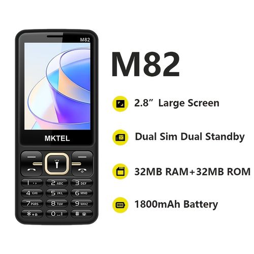 MKTEL M82 Classic Black Elderly Feature Phone | 2.8-inch Large Display, Dual Sim Dual Standby, Long Battery Life, Non, Battery, 2G Technology, Micro-USB Connector
